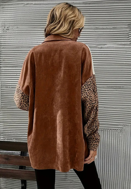 Leopard Print Button Up, Casual Drop Shoulder, Long Sleeve Breast Pocket Blouse