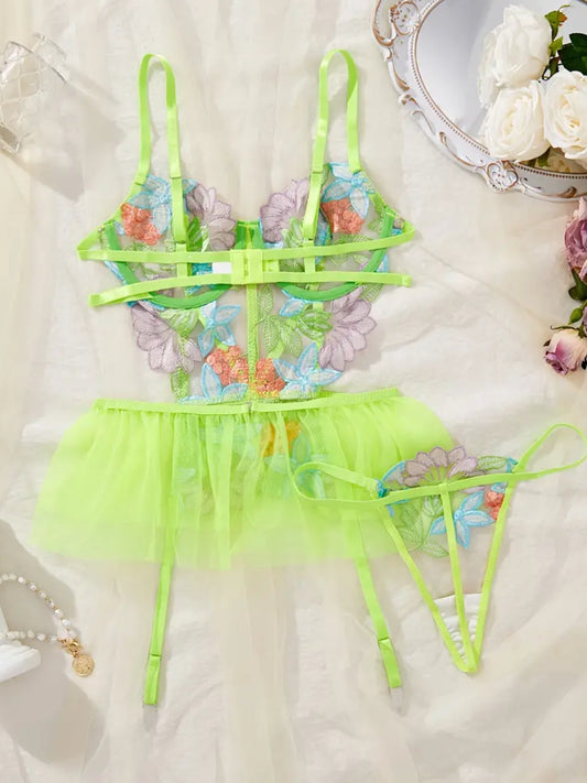 Criss Cross Hollow Out Semi Sheer Teddy With Garter Belts & Thong