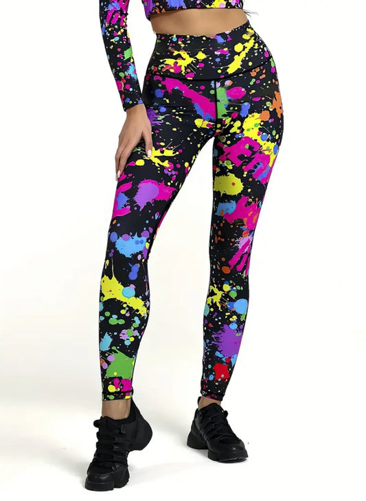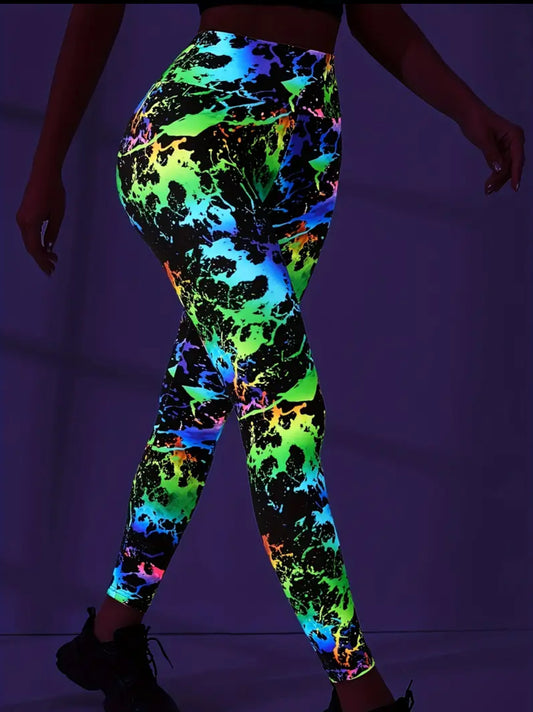 High-Waist Fluorescent Print Leggings, Yoga Butt Lift Pants, Breathable Sportswear
