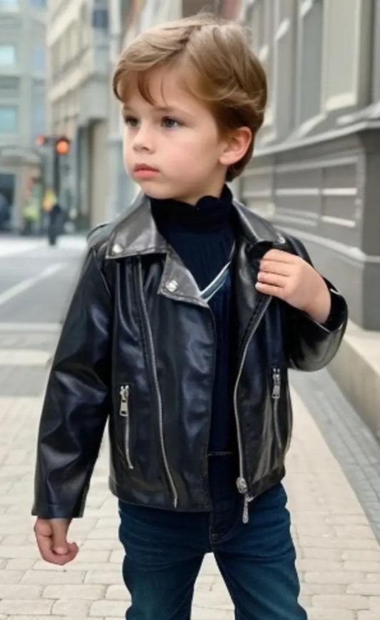 Chaqueta de moto de cuero para niños, bolsillo con cremallera, lavable a máquina, corte holgado