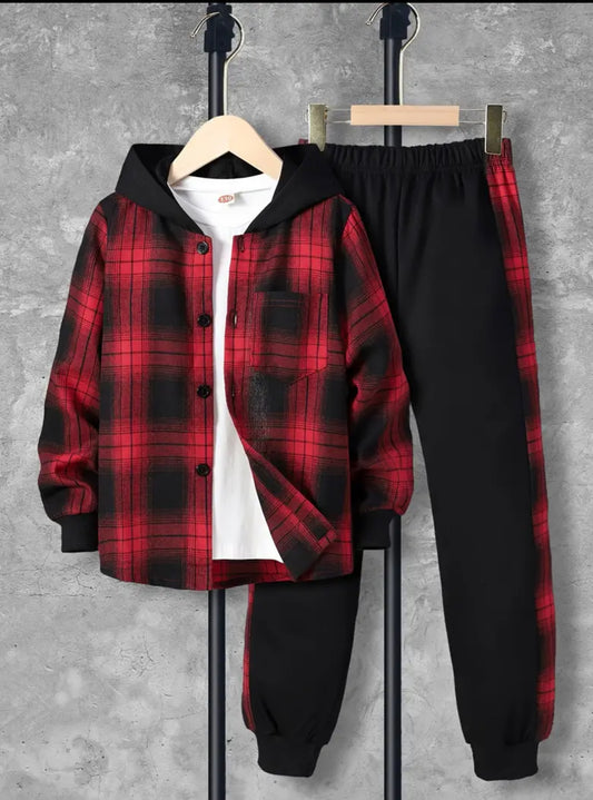 Conjunto de 2 piezas de camisa con capucha y pantalones deportivos con estampado de cuadros para niño