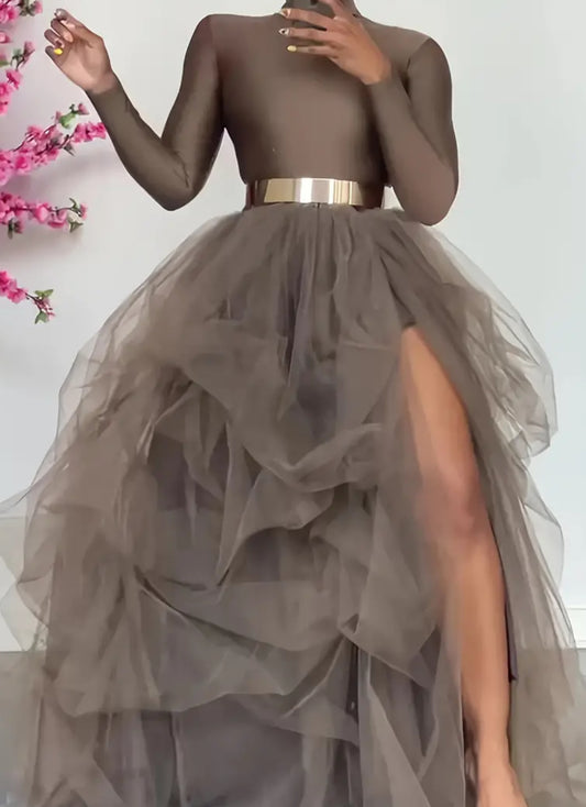 Falda princesa con abertura frontal, corte A, cintura alta, tul suave en capas y malla abullonada “Queen Elegance”, elegante 💋 Mommies