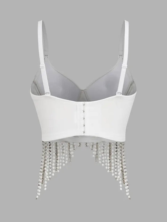Blusa con tirantes finos y decoración de cuentas para mujer, sin mangas y dobladillo con flecos