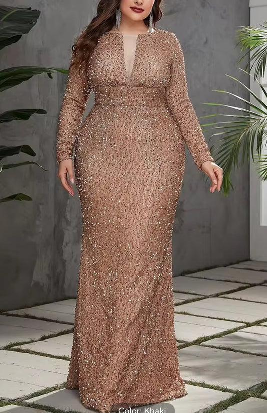 Vestido de sirena de lujo con escote en V y mangas largas y lentejuelas, tallas L a 4XL