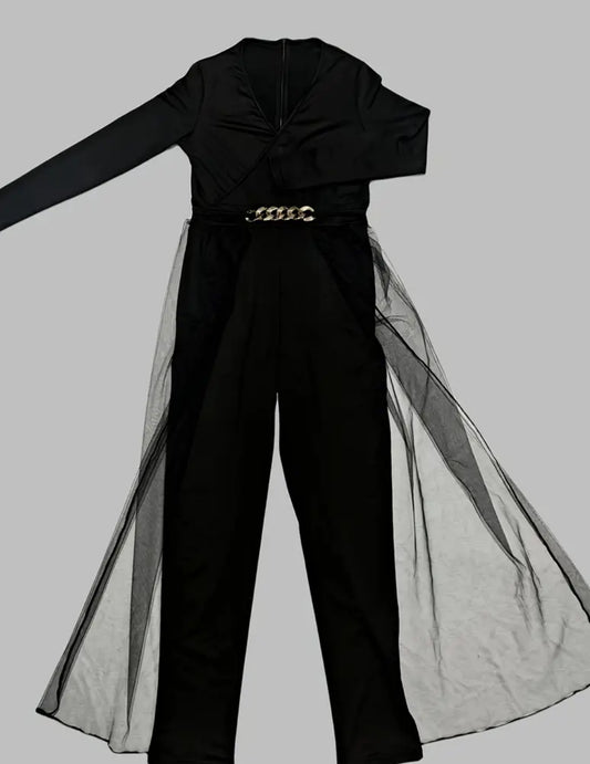 Mono con panel de malla color carbón, sin transparencias, elegante escote en V, cinturón con detalle de hebilla dorada