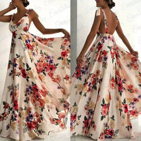 Vestido largo con tirantes anudados y escote en V elegante y estilo fluido con espalda descubierta 🌺