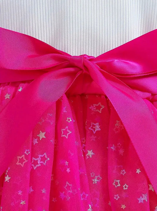 Blusa con volantes en los hombros en color rosa intenso + falda tutú de malla asimétrica 🩷🤍
