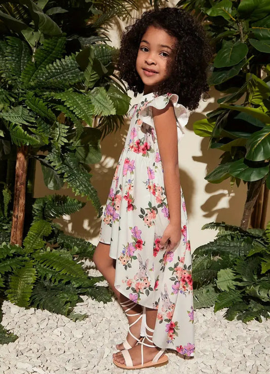 Vestido fluido de corte alto y bajo con mangas de mariposa y “floral elegante”