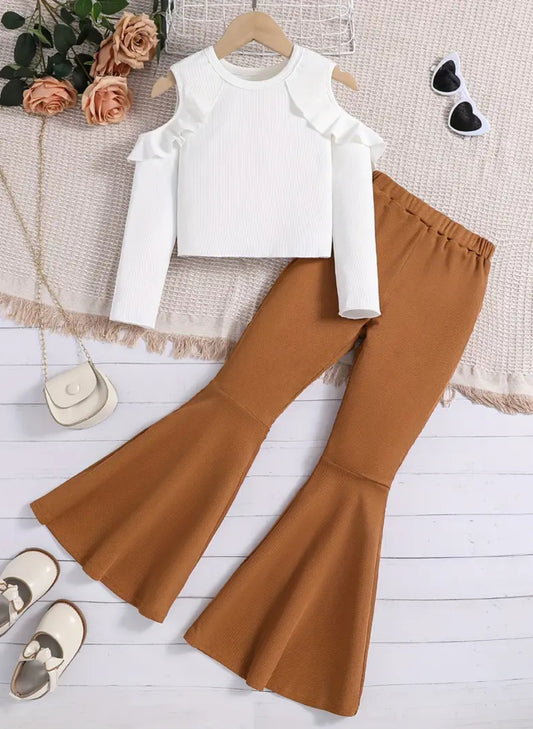 2pcs Elegant Cold Shoulder Long Sleeve Top and Flare Pants Set