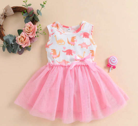 Girls Pastel Dinosaurs Mesh Dress Sleeveless