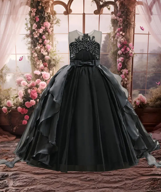 Girls Long Tulle Princess Dress Embellished Embroidery