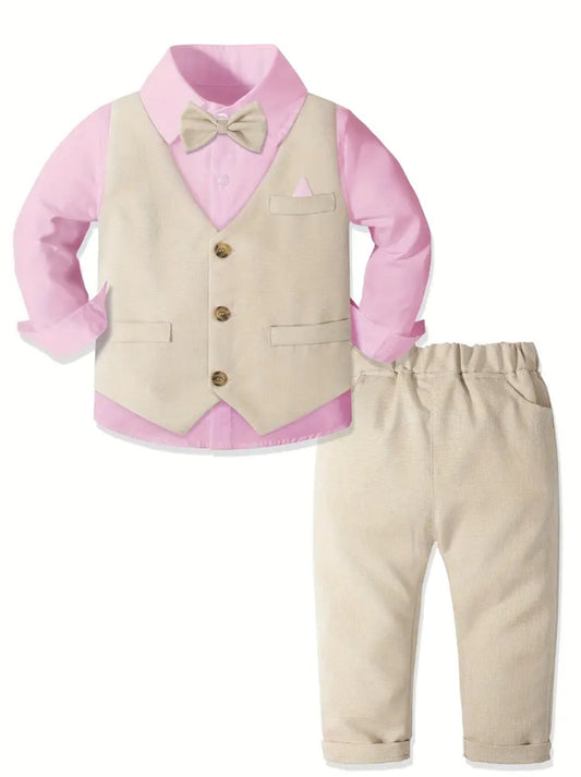 Spring Colors, 4pcs Boy's Gentleman Outfit, Bowtie & Shirt & Vest & Pants Set