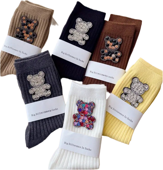 6 Pairs, Designer “Rhinestone Modish Teddy Bear” Mid Tube