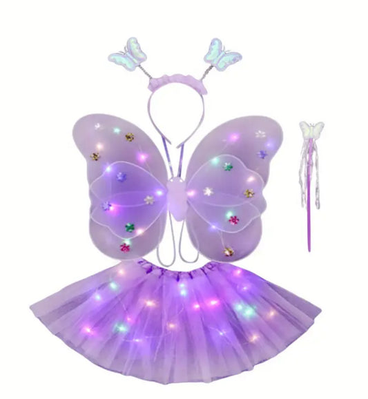 Girl's LED Fairy Costume Set, Butterfly Wings + Tutu Skirt Headband, Wand, 3Y-14Y
