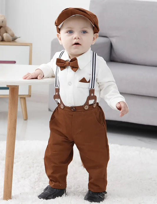 4pcs Baby Long-sleeved Gentleman Suit - Baby Triangle Jumpsuit, Beret, Suspenders, Bow Tie Set, 0-24 Months Soft And Comfortable Toddler Dress