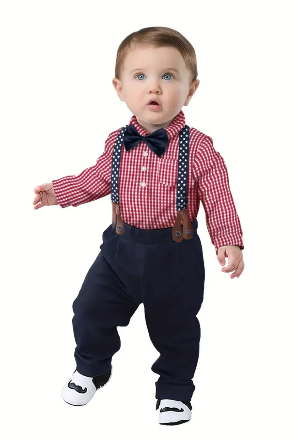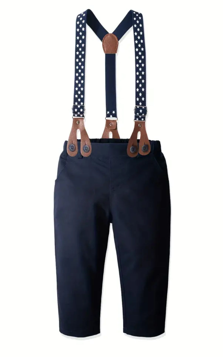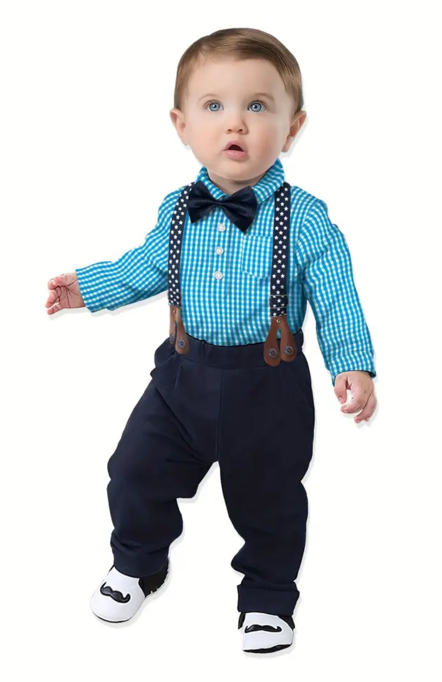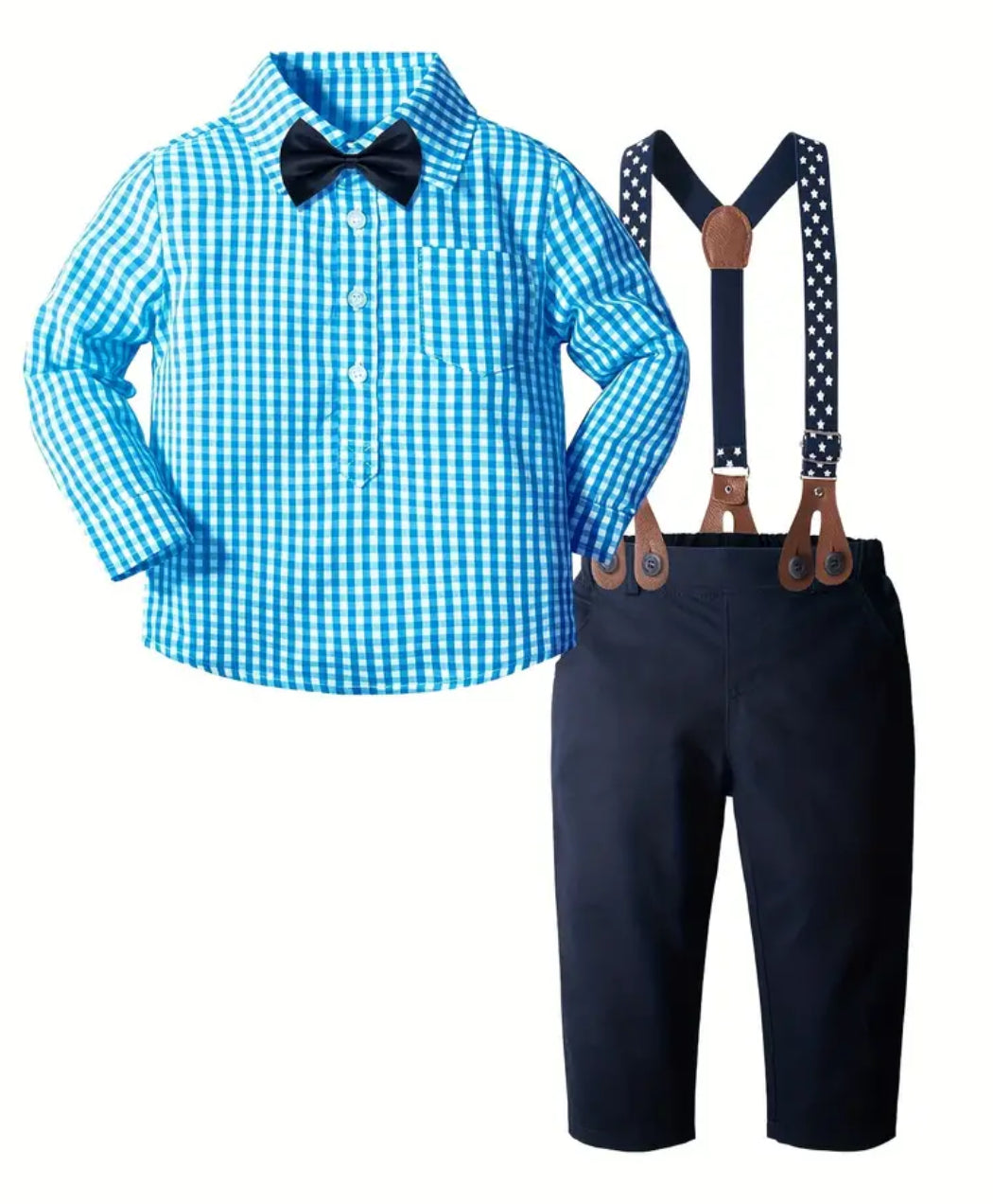 Long sleeve shirt with a stylish bowtie, suspender pants for a touch of charm, and a vest for added sophistication.