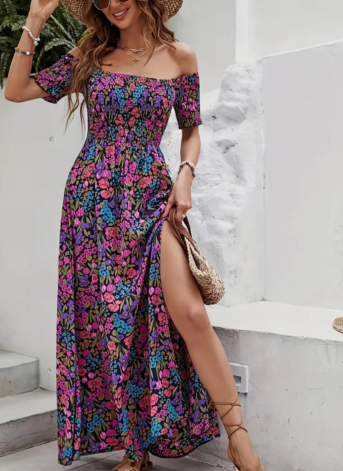 “Floral Fantasy” Off Shoulder Dress, Elegant Backless Shirred Short Sleeve Split Dress