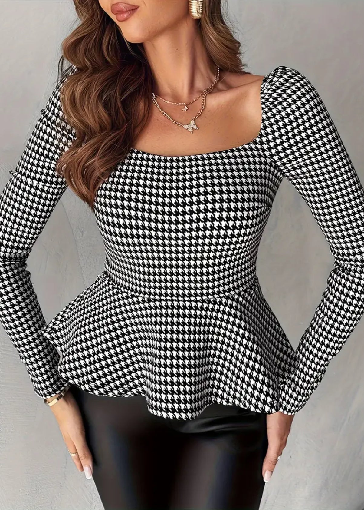 Achieve a timeless and elegant look with our Houndstooth Pattern Square Neck top.