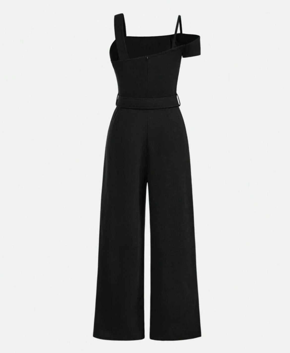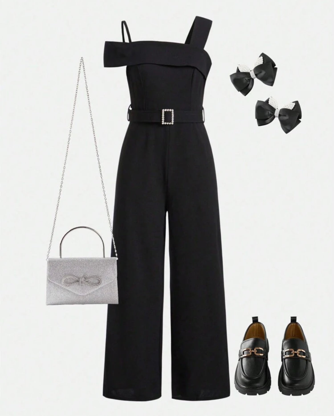 Tween “Girl Biz” 🖤 Casual Solid Color, Shoulder Strap, Glitz Belt Jumpsuit