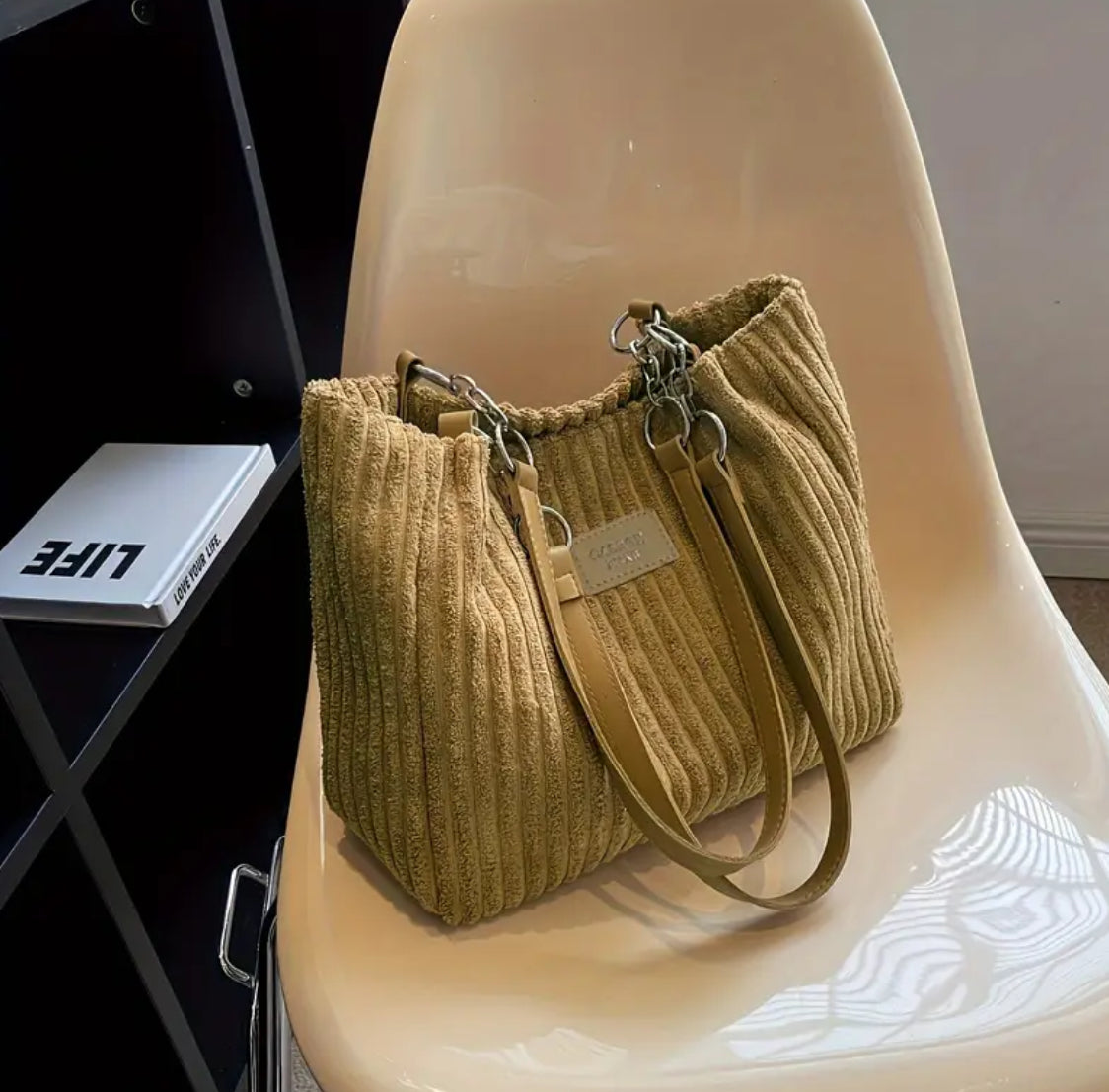 “Soft Lilibeth” Striped Corduroy Shoulder Bag with Chain Detail
