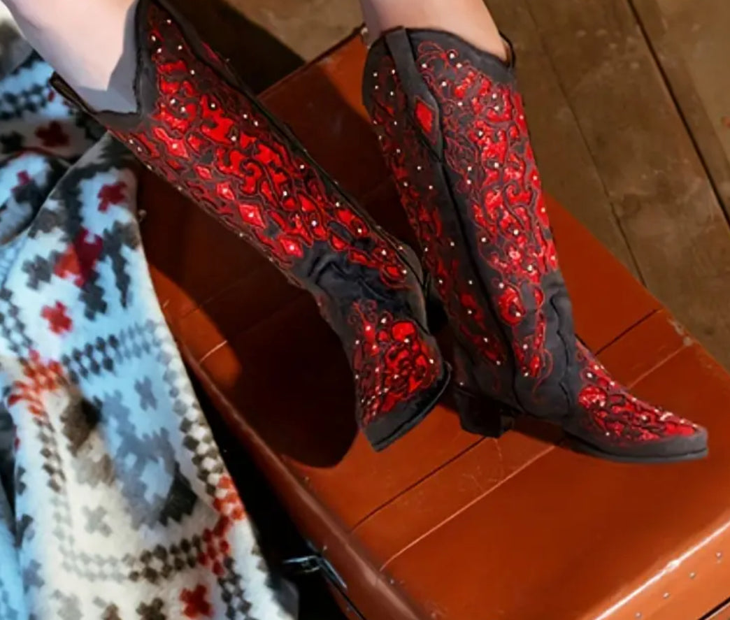 “Red, Red Wine” Women's Rhinestone Embellished, Mid Calf Fashion Boot