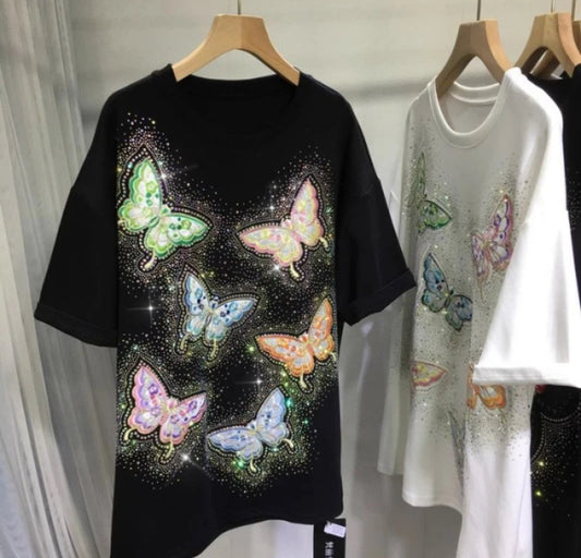 Flutura me diamant i rremë me vezullim, Qëndisje shumëngjyrëshe në madhësi plus, T-shirt për femra