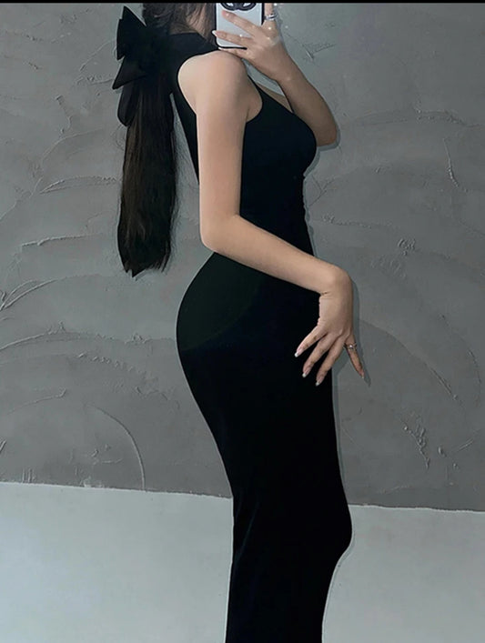 Fustan elegant me shpatulla të zbrazura, fustan maksi të zi, seksi me mëngë të gjata