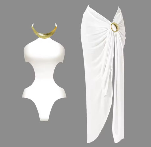 2 Pc Hollow Elegant Neckline Swimsuit + Long Cover-Up Skirt