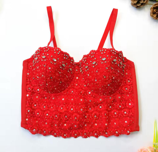 Crystal Embellished 1 Piece Bustier Semi Transparent Bright Floral Lace