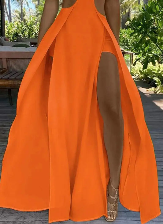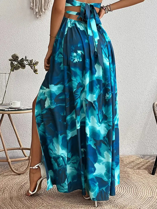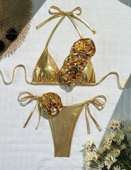 Gold 3D Floral Halter Tie Neck 2 Pcs Bikini Set